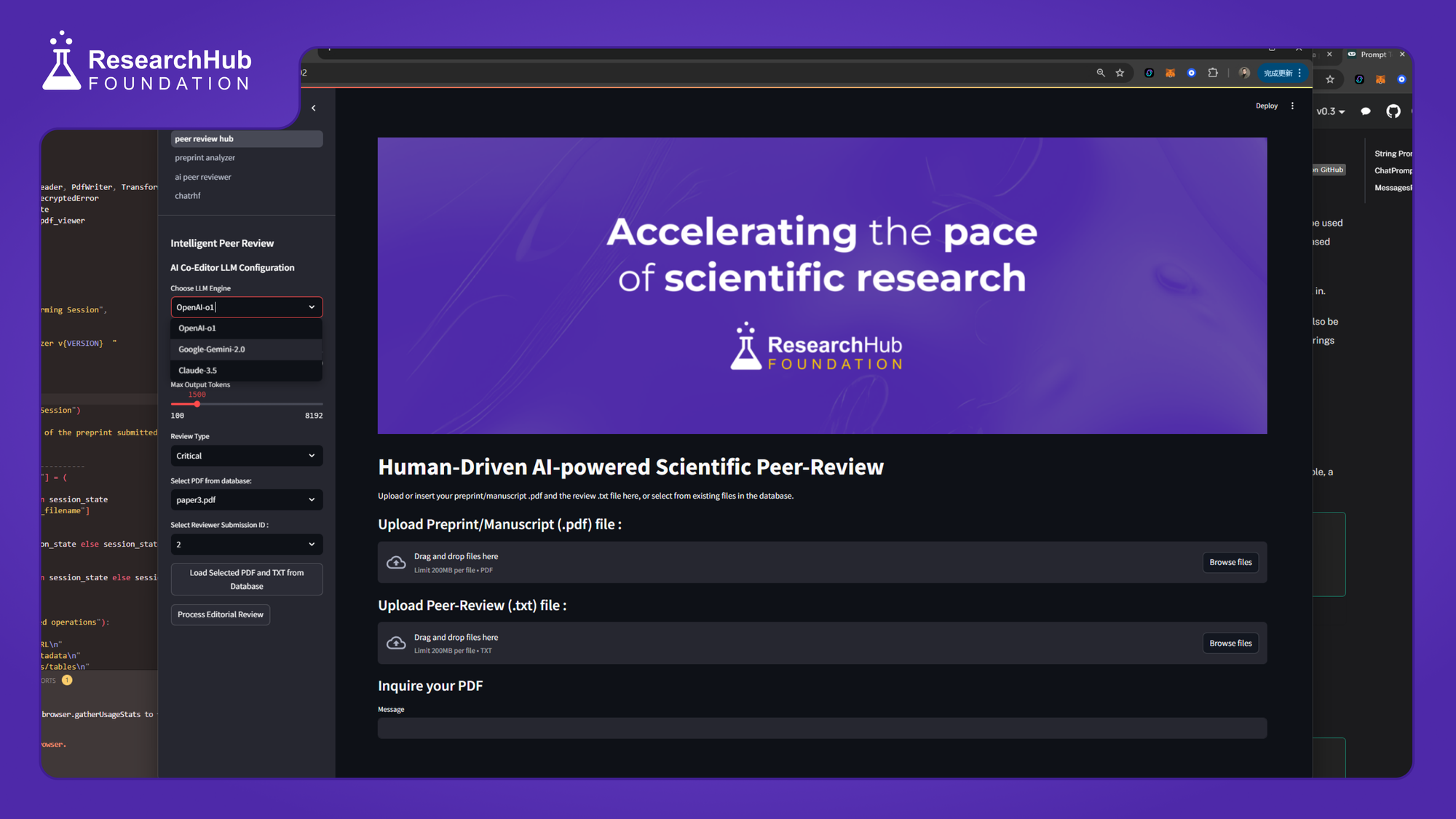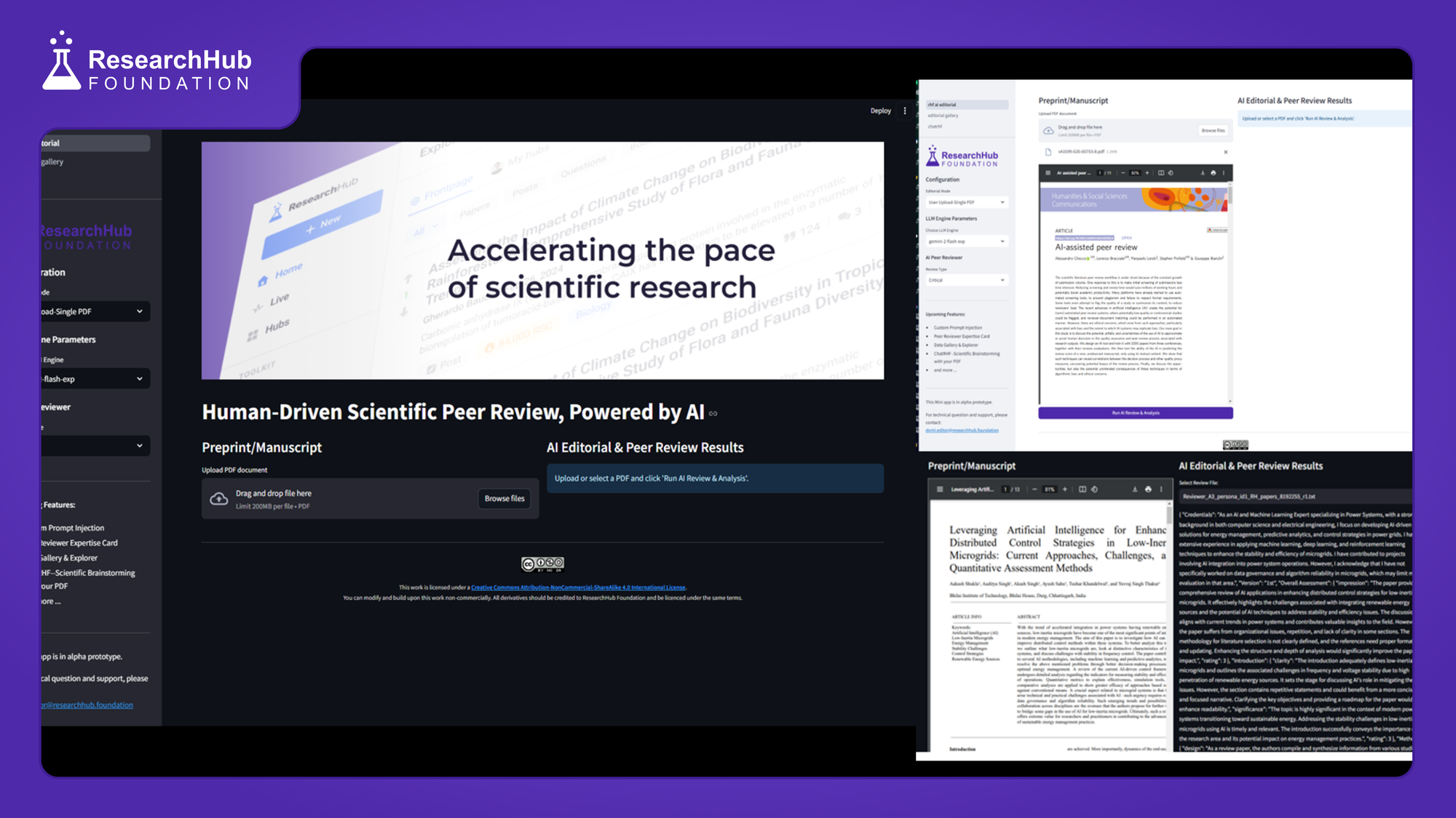 We have finalized the backend Python package for driving the AI agents available on our prototype app. We are now focused on refining the UI/UX to enable users to test and experiment with the AI Editors and Peer Reviewers. Several features are currently being designed and tested for further development. In addition to the current multi-LLM engine AI editorial tools, we will soon include: (1) Custom Prompt Injection, (2) Peer Reviewer Expertise Card, (3) Data Gallery and Explorer, (4) ChatRHF - Scientific Brainstorming with your PDF, and more features to come.